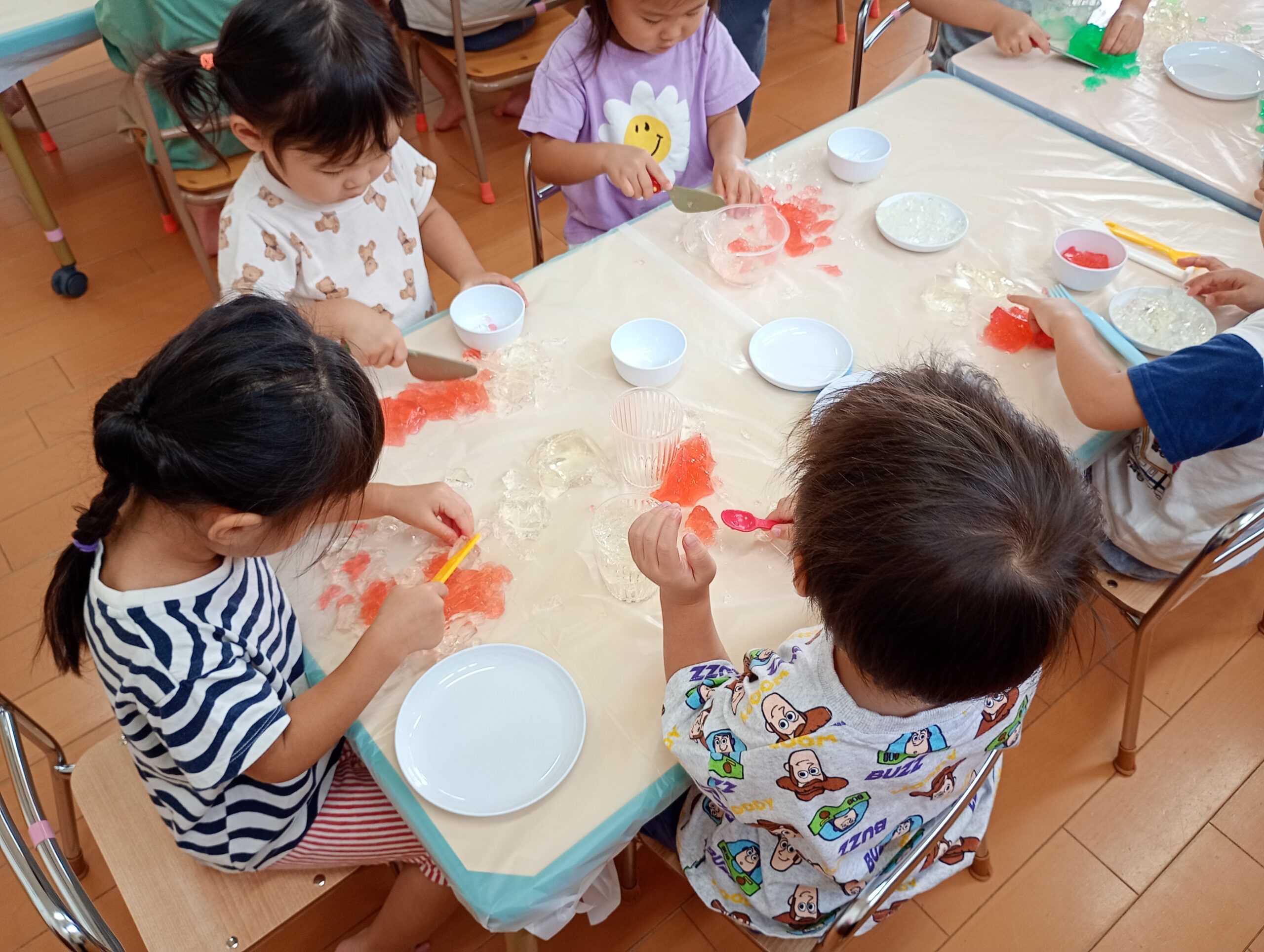 うさぎ組が寒天を使った感触遊びを楽しみました